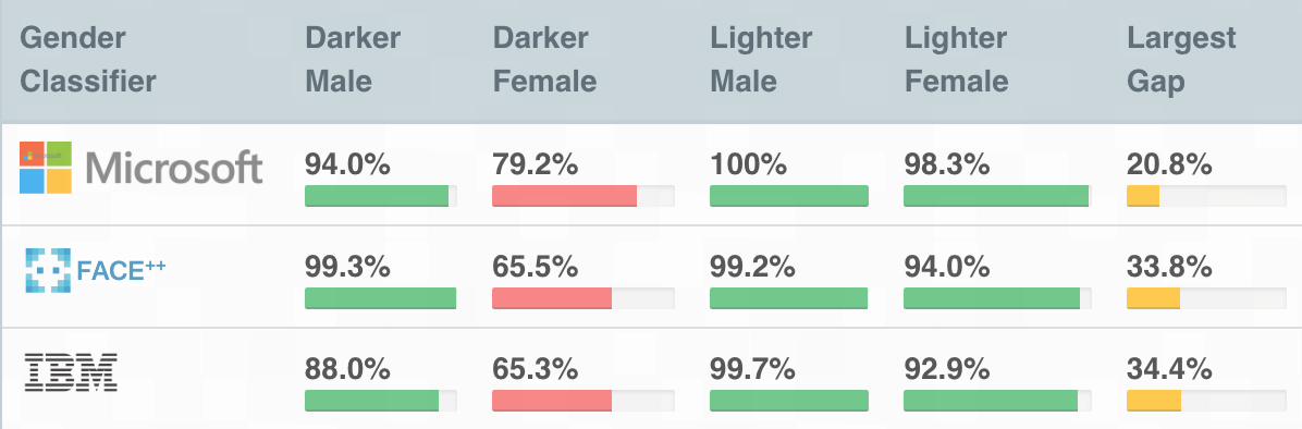 One of the early, widely cited fairness wake-up calls in computer vision was the 2018 Gender Shades audit by Joy Buolamwini and Timnit Gebru, which tested commercial face-based “gender classification” systems and found large error gaps across skin tone and gender presentation: darker-skinned women were misclassified far more often (up to 34.7% error), while lighter-skinned men saw much lower error (up to 0.8%).